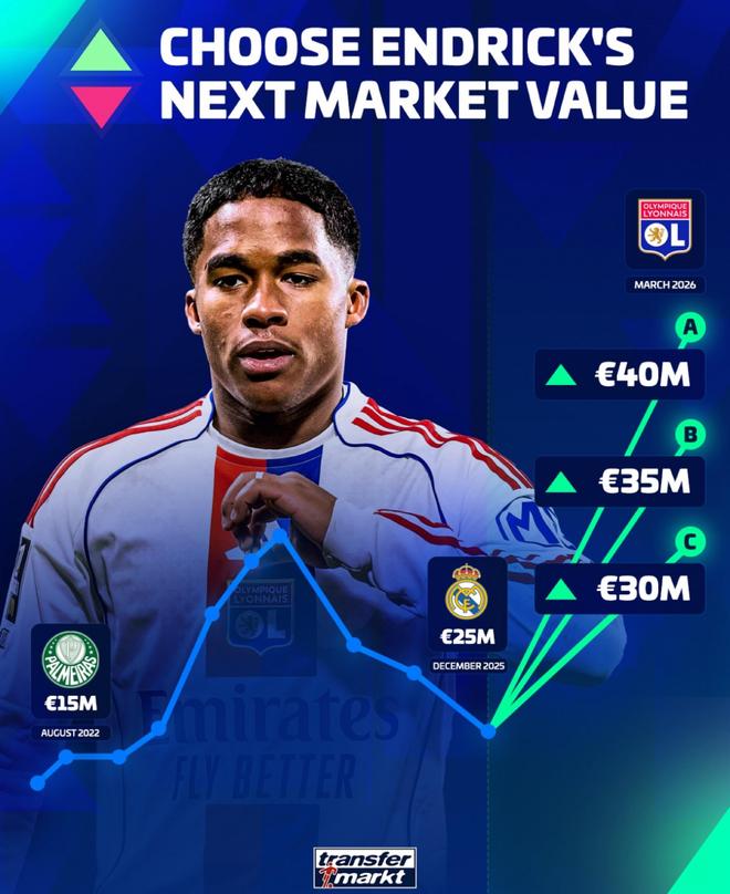 恩德里克现年19岁,司职前锋,本赛季冬窗从皇马租借加盟里昂,截至目前共为球队出场14次,打进6球,送出4次助攻。